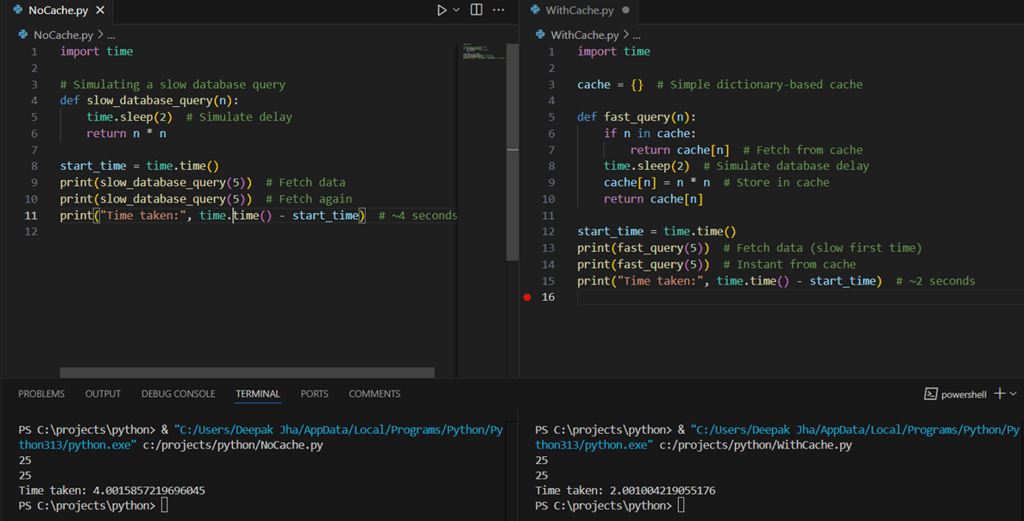 Execution of WithCache.py in the right image shows that the second call to database is instant because the data is fetched from memory!